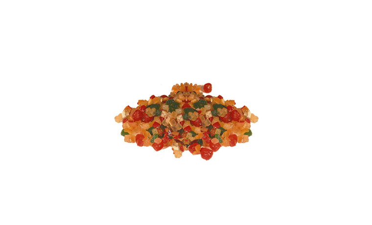 Cette macédoine de fruits confits est réalisée à partir de 3 sortes de fruits : les écorces d'orange, la papaye rouge, la papaye verte. Les fruits sont coupés en cubes de 6 mm de côté.