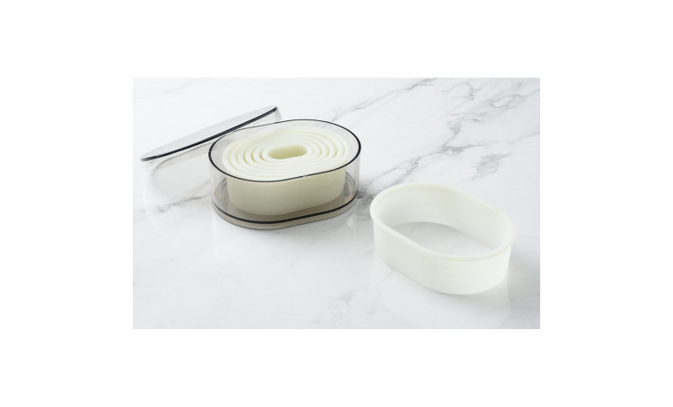 Boîte de 7 découpoirs ovales arrondis unis en matériau composite polyglass (plastique alimentaire résistant jusqu'à 160°C).