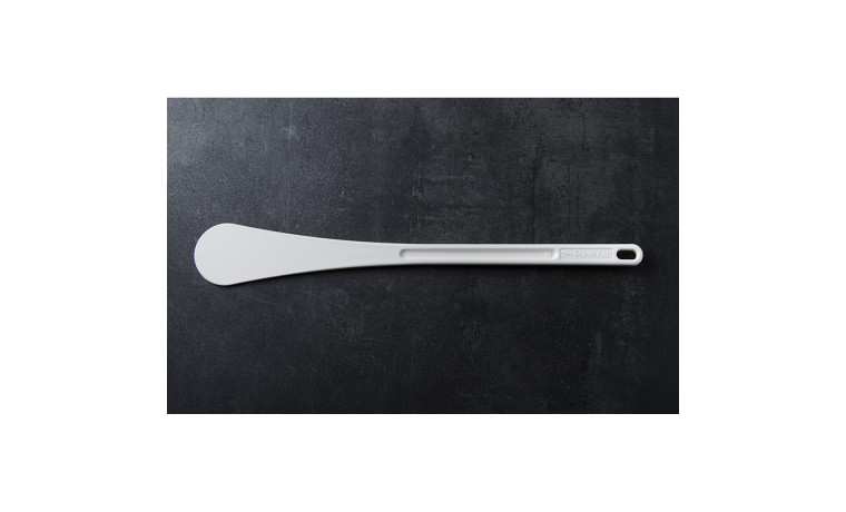 Spatule fabriquée en matériau Exoglass, matériau résistant aux températures élevées jusqu'à 220°C et répondant aux normes NF hygiène alimentaire.