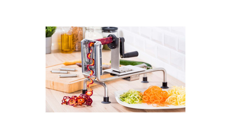 "Le Rouet"® MADE IN FRANCE réalise vos décors en un tour de main ! Appareil à couper les légumes en spaghettis, tagliatelles ou guirlandes, permettant de réaliser de façon originale : crudités, salades, décorations, accompagnements de plats, recettes, ...